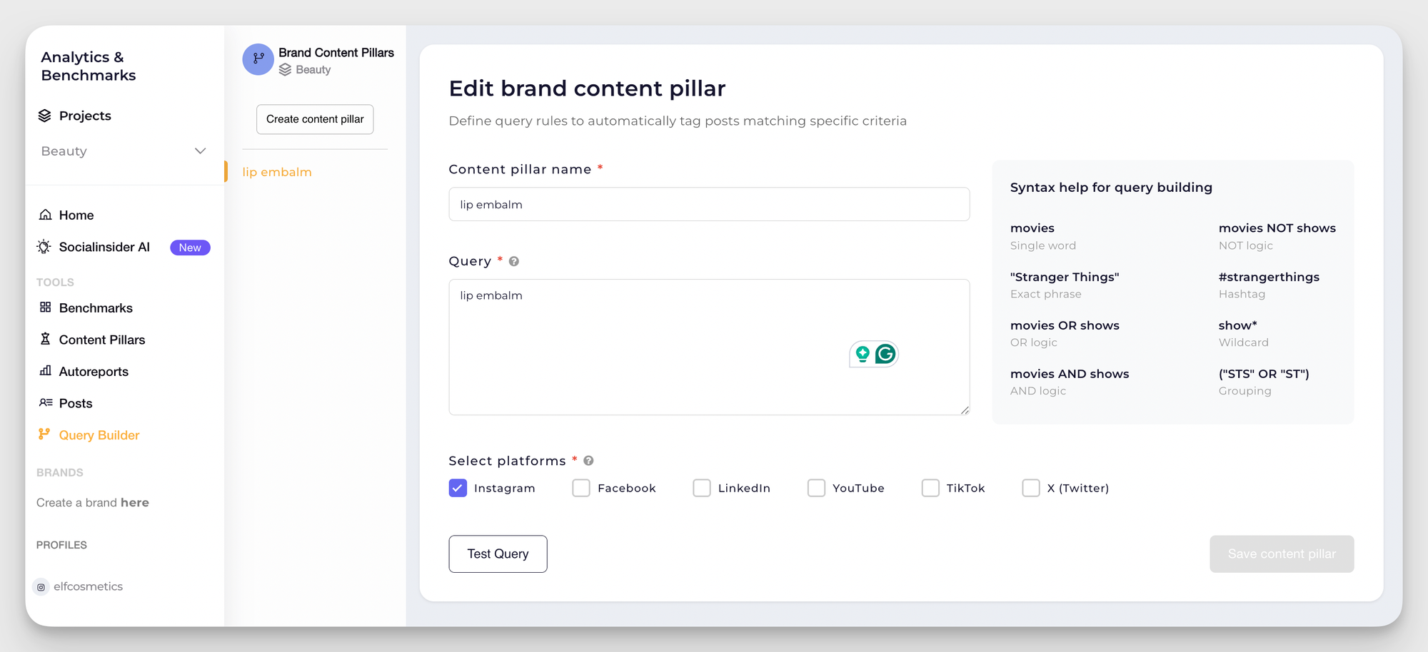 To effectively analyze your content pillars, Socialinsider offers a robust Query builder, which allows you to tag content based on different query types across different platforms.