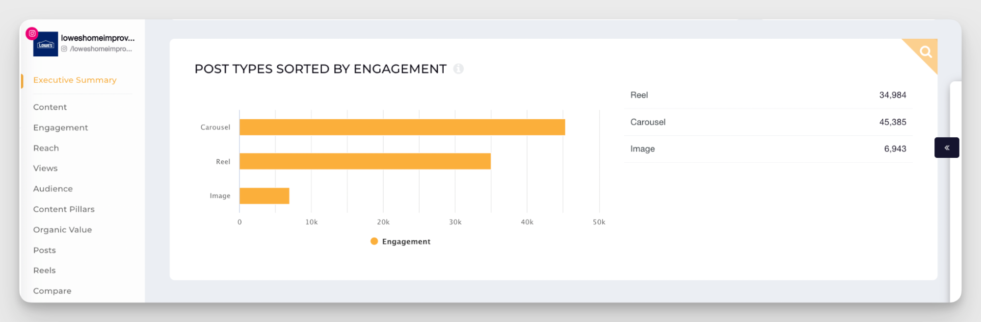 Let me give you an example. Let's analyze together Lowe's Instgaram strategy. Looking at their content mix, we can see that the majority of their posts are Reels, with carousels and static images accounting for a much smaller share.