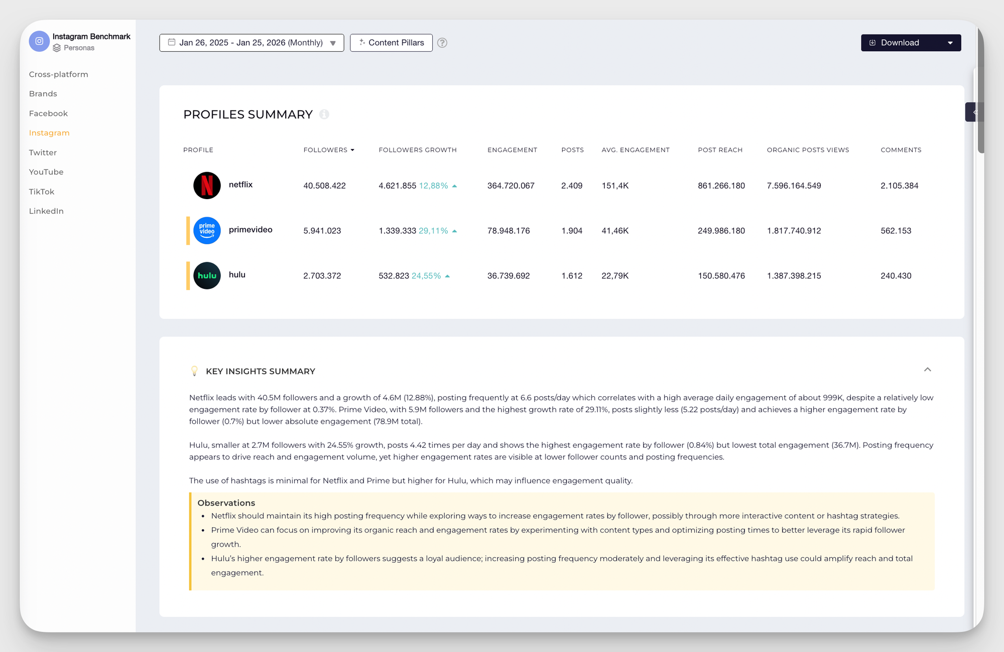 Say you know how you’re doing on Instagram, but do you know how your content stacks up to your competitors—across every channel, all in one view? That’s where Socialinsider’s cross-channel competitive benchmarking comes in. It’s not just about counting likes and comments; it’s about understanding the bigger picture, fast.