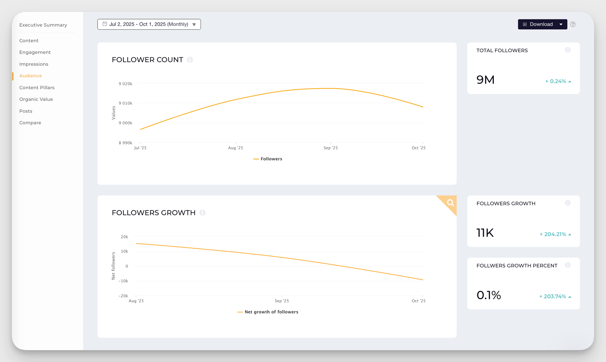 Content metrics – Monitoring top tweets, best performing content pillars, and the most engaging formats shows you what themes and formats resonate most with your audience.